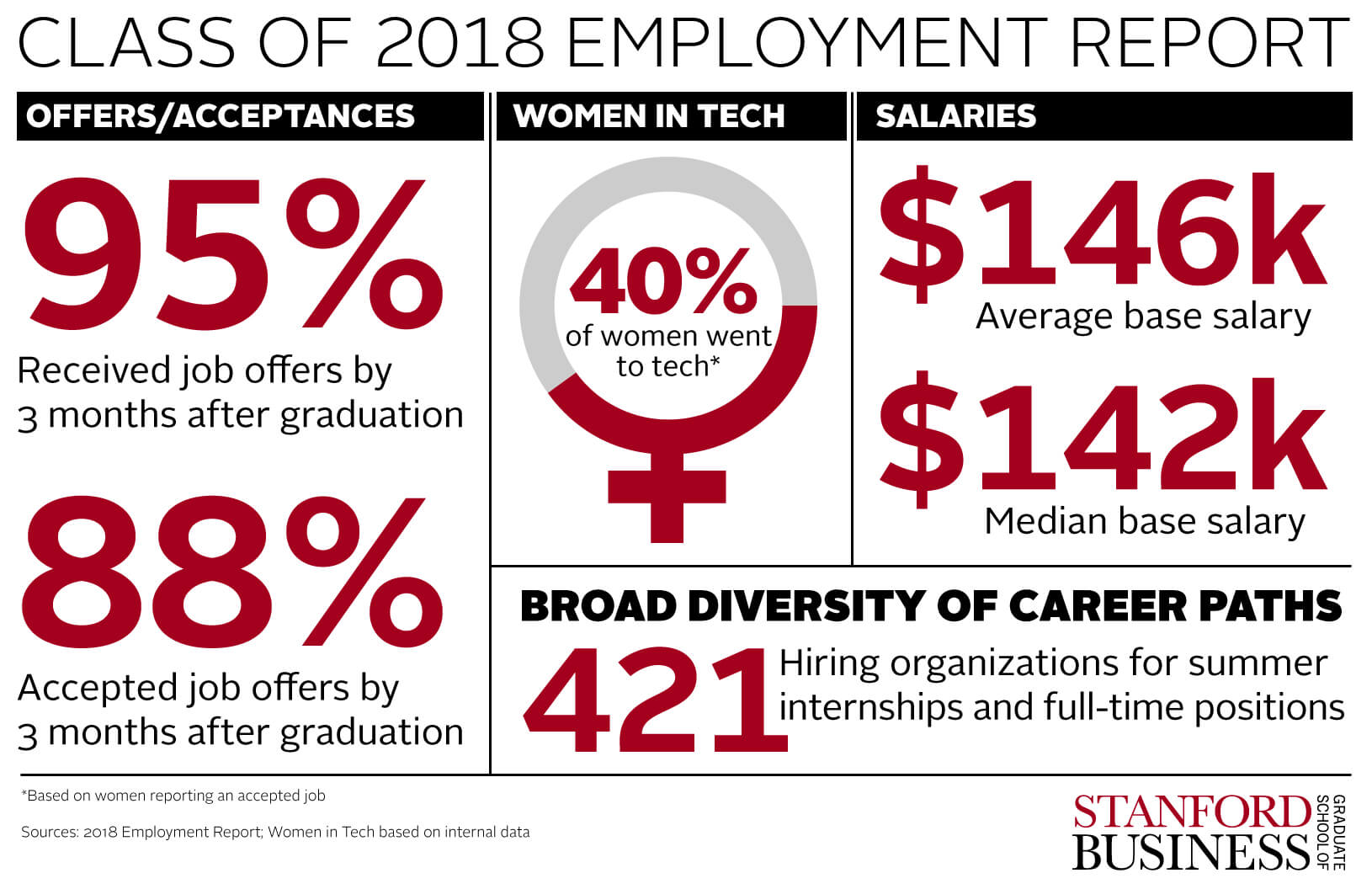 At 90 days after Stanford GSB’s Jun. 16, 2018 graduation, 88% of the class accepted offers, same as last year; and 95% had offers, a 3-point rise.